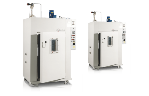 The internal dimensions of the VFT60/90 device are 600 x 600 x 900 mm (w x d x h). The dryer can be fitted with grates or sheets with a higher load capacity. It is intended exclusively for areas falling within category 3G, zone 2 according to ATEX. Heating processes falling within category 2G/zone 1, temperature classes T1 to T4 can then be carried out inside, with the maximum heating temperature set according to the temperature class. The device is always flushed with compressed air before use and the range of modifications and accessories is relatively limited.